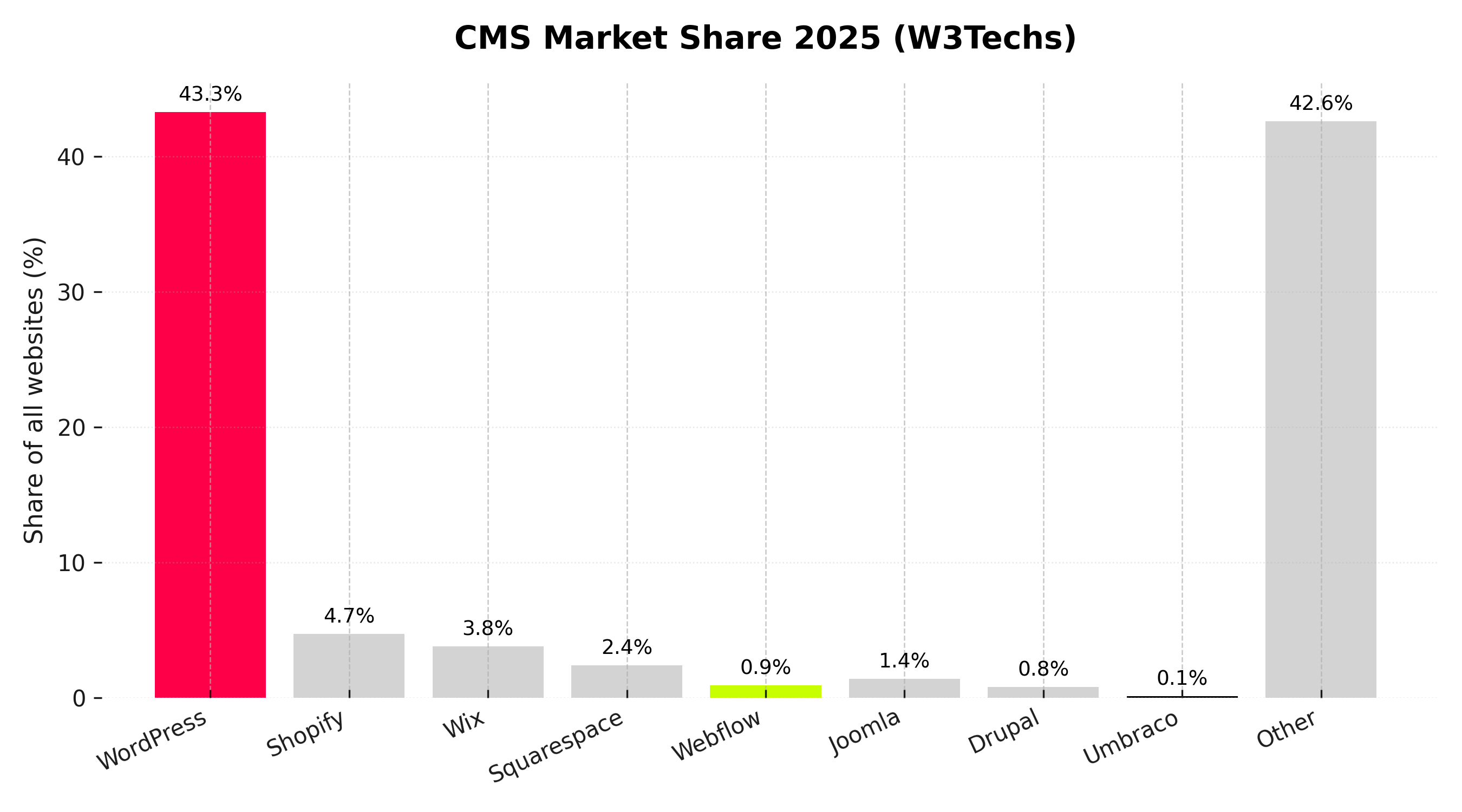 According to W3Techs, WordPress still dominates the CMS landscape, powering about 43% of all websites. Platforms like Shopify, Wix, Squarespace, Joomla, Drupal and Webflow hold smaller shares (but these are growing!).