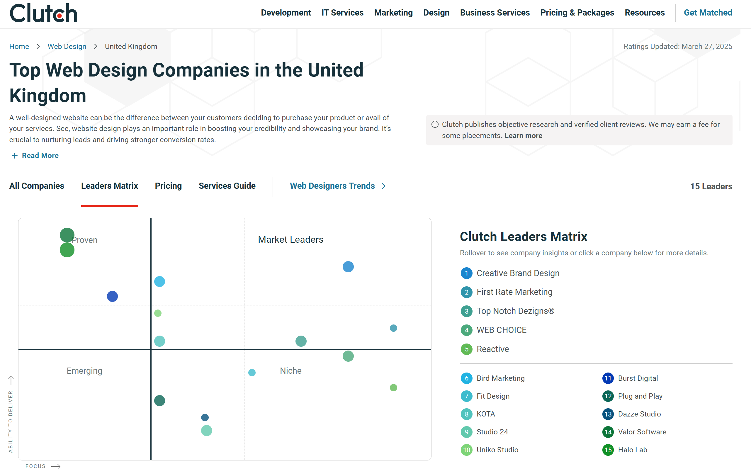We’ve positioned ourselves at the top, both as curators of this list and a team that regularly ranks among the best web design agencies in the UK. For example, on Clutch, we’re second in their leaders’ matrix based on our specialist focus area, great reviews, multiple industry awards, and high-quality past work.